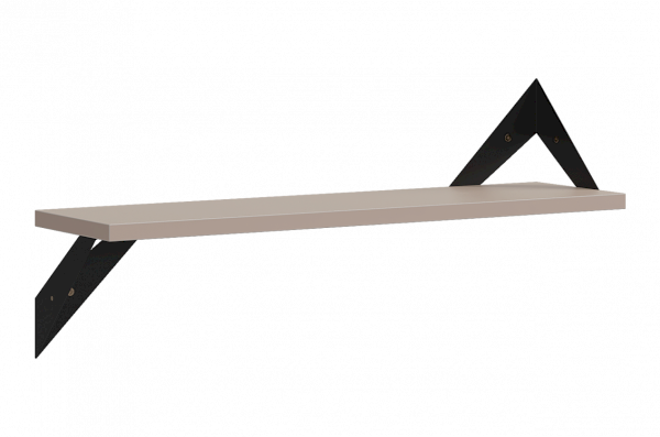 Полка крепится к стене с помощью чёрных треугольных держателей, которые обеспечивают устойчивость и долговечность. Особенность модели в том, что держатели можно расположить сверху, снизу или один сверху, другой снизу, что позволяет адаптировать полку под любые интерьерные решения и потребности.